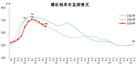 4月中旬,螺紋鋼庫存594萬噸,環(huán)比減少37萬噸,下降5.9%,庫存繼續(xù)下降;比年初增加289萬噸,上升94.8%;比上年同期減少12萬噸,下降2.0%。
