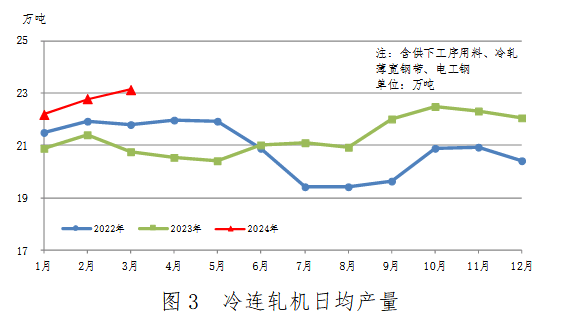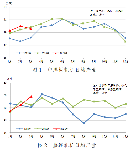 中厚板軋機、熱連軋機、冷連軋機日均產(chǎn)量變化見圖1、圖2、圖3。