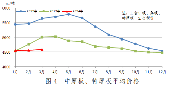 3月份,中厚板產(chǎn)量532萬噸,同比增加1萬噸,上升0.1%;銷售537萬噸,其中出口36萬噸,產(chǎn)銷率101.0%;售價4540元/噸,比上月上漲21元/噸。累計產(chǎn)量1545萬噸,同比增加36萬噸,上升2.4%。中厚板、特厚板平均價格見圖4。