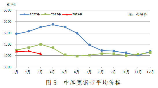 3月份,中厚寬鋼帶產(chǎn)量716萬噸,同比減少12萬噸,下降1.6%;銷售715萬噸,其中出口52萬噸,產(chǎn)銷率99.9%;售價4070元/噸,比上月下跌130元/噸。累計產(chǎn)量1982萬噸,同比減少62萬噸,下降3.0%。中厚寬鋼帶平均價格見圖5。