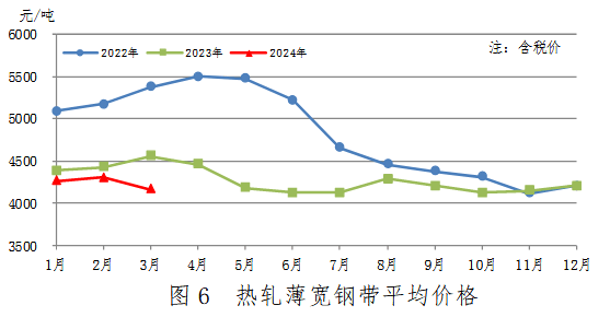 3月份,熱軋薄寬鋼帶產(chǎn)量256萬噸,同比增加26萬噸,上升11.5%;銷售257萬噸,其中出口28萬噸,產(chǎn)銷率100.1%;售價4169元/噸,比上月下跌137元/噸。累計產(chǎn)量728萬噸,同比增加53萬噸,上升7.8%。熱軋薄寬鋼帶均價見圖6。