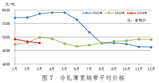 3月份,冷軋薄寬鋼帶產(chǎn)量382萬噸,同比增加47萬噸,上升14.0%;銷售379萬噸,其中出口17萬噸,產(chǎn)銷率99.2%;售價4790元/噸,比上月下跌50元/噸。累計產(chǎn)量1090萬噸,同比增加106萬噸,上升10.8%。冷軋薄寬鋼帶平均價格見圖7。