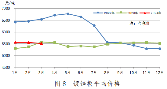 3月份,鍍鋅板產(chǎn)量238萬噸,同比增加32萬噸,上升15.3%;銷售242萬噸,其中出口23萬噸,產(chǎn)銷率101.9%;售價5515元/噸,比上月下跌38元/噸。累計產(chǎn)量675萬噸,同比增加62萬噸,上升10.2%。鍍鋅板平均價格見圖8。