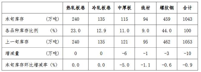 6月中旬,21個城市5大品種鋼材社會庫存1043萬噸,環(huán)比減少10萬噸,下降0.9%,庫存繼續(xù)小幅下降;比年初增加314萬噸,上升43.1%;比上年同期增加87萬噸,上升9.1%。