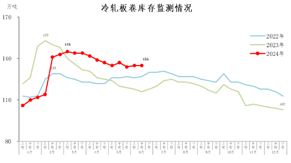 6月中旬,冷軋板卷庫存135萬噸,環(huán)比持平,庫存小幅波動;比年初增加32萬噸,上升31.1%;比上年同期增加19萬噸,上升16.4%。