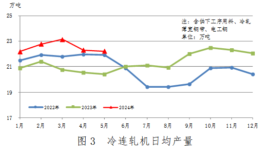 冷連軋機(jī)5月份生產(chǎn)689萬(wàn)噸,同比增加55萬(wàn)噸,上升8.7%;其中商品量458萬(wàn)噸,同比增加32萬(wàn)噸,上升7.5%,升幅有所擴(kuò)大;供下工序用料231萬(wàn)噸,同比增加23萬(wàn)噸,上升11.2%。冷連軋機(jī)累計(jì)生產(chǎn)3422萬(wàn)噸,同比增加288萬(wàn)噸,上升9.2%。
