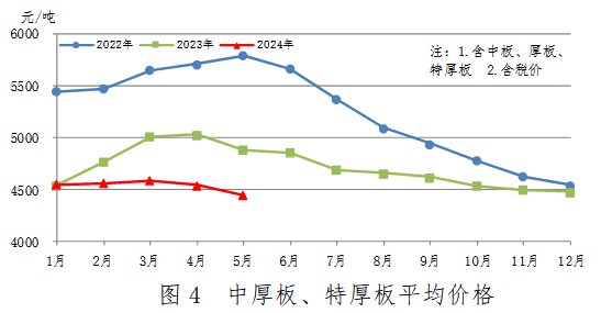 5月份,中厚板產(chǎn)量560萬(wàn)噸,同比減少4萬(wàn)噸,下降0.7%,產(chǎn)量由升轉(zhuǎn)降;銷(xiāo)售555萬(wàn)噸,其中出口42萬(wàn)噸,產(chǎn)銷(xiāo)率99.0%;售價(jià)4387元/噸,比上月下跌101元/噸。累計(jì)產(chǎn)量2580萬(wàn)噸,同比增加6萬(wàn)噸,上升0.2%。中厚板、特厚板平均價(jià)格見(jiàn)圖4。