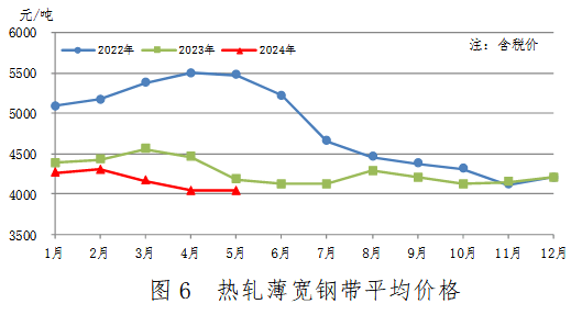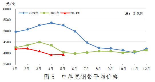 5月份,中厚寬鋼帶產(chǎn)量688萬(wàn)噸,同比減少73萬(wàn)噸,下降9.6%,降幅有所收窄;銷(xiāo)售693萬(wàn)噸,其中出口63萬(wàn)噸,產(chǎn)銷(xiāo)率100.7%;售價(jià)3923元/噸,比上月上漲17元/噸。累計(jì)產(chǎn)量3327萬(wàn)噸,同比減少220萬(wàn)噸,下降6.2%。中厚寬鋼帶平均價(jià)格見(jiàn)圖5。
