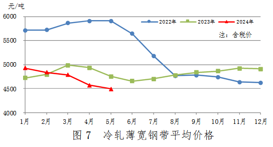 5月份,冷軋薄寬鋼帶產(chǎn)量357萬(wàn)噸,同比增加26萬(wàn)噸,上升7.7%,升幅繼續(xù)收窄;銷(xiāo)售350萬(wàn)噸,其中出口15萬(wàn)噸,產(chǎn)銷(xiāo)率97.8%;售價(jià)4496元/噸,比上月下跌76元/噸。累計(jì)產(chǎn)量1801萬(wàn)噸,同比增加171萬(wàn)噸,上升10.5%。冷軋薄寬鋼帶平均價(jià)格見(jiàn)圖7。