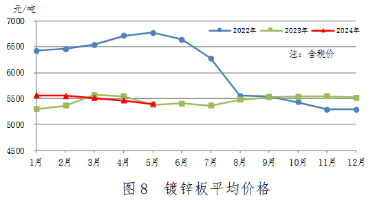 5月份,鍍鋅板產(chǎn)量228萬(wàn)噸,同比增加22萬(wàn)噸,上升10.7%,升幅有所擴(kuò)大;銷(xiāo)售224萬(wàn)噸,其中出口16萬(wàn)噸,產(chǎn)銷(xiāo)率98.1%;售價(jià)5401元/噸,比上月下跌62元/噸。累計(jì)產(chǎn)量1123萬(wàn)噸,同比增加99萬(wàn)噸,上升9.6%。鍍鋅板平均價(jià)格見(jiàn)圖8。