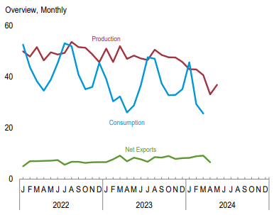 消費方面,報告顯示,2024年3月份,美國煤炭總消費量為2562.2萬短噸,同比下降20.56%,環(huán)比下降12.5%。