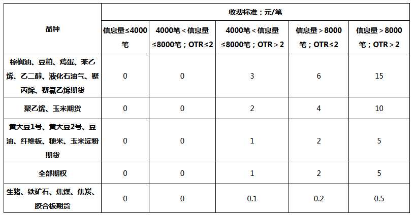 申報(bào)費(fèi)按日收取,期貨合約申報(bào)費(fèi)按合約統(tǒng)計(jì),期權(quán)合約申報(bào)費(fèi)按合約月份統(tǒng)計(jì)。各期貨、期權(quán)合約收費(fèi)標(biāo)準(zhǔn)如下: