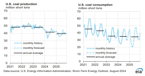 產(chǎn)量方面,《短期能源展望》報告預計,2024年,美國煤炭產(chǎn)量為4.99億短噸,低于前一月預期值5.097億短噸,較2023年的5.775億短噸下降13.59%。2025年,美國煤炭產(chǎn)量預計為4.74億短噸,同比下降5.01%。