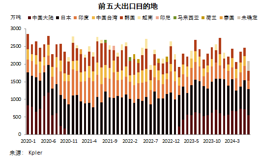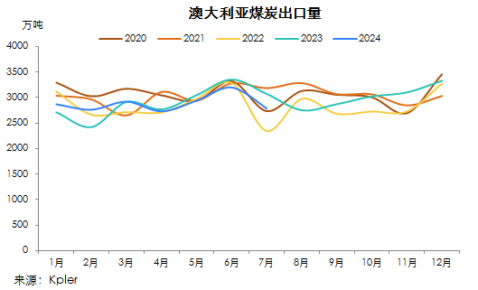 Kpler船舶追蹤數據顯示,2024年7月份,澳大利亞煤炭出口量2786.81萬噸,環(huán)比降12.82%,在連續(xù)兩個月增長后回落,同比降9.26%。