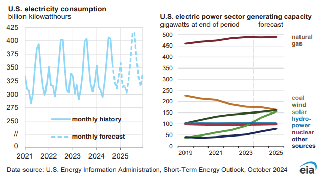 能源信息署預(yù)計,2024和2025年,美國電力需求預(yù)計將分別達到40930億千瓦時和41630億千瓦時,但這略低于9月份發(fā)布的需求預(yù)期值。