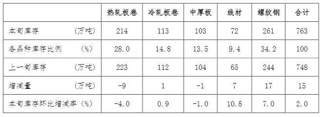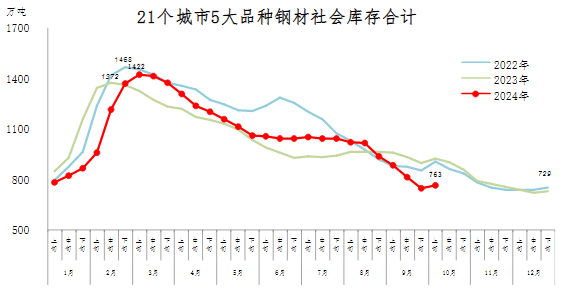 10月上旬,21個城市5大品種鋼材社會庫存763萬噸,環(huán)比增加15萬噸,上升2.0%,庫存連續(xù)8旬下降后首次上升;比年初增加34萬噸,上升4.7%;比上年同期減少161萬噸,下降17.4%。