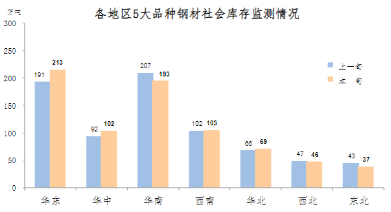 10月上旬,分地區(qū)來看,七大區(qū)域鋼材庫存環(huán)比各有升降,具體情況為:華東庫存環(huán)比增加22萬噸,上升11.5%,為增量和升幅最大地區(qū);華中增加10萬噸,上升10.9%;華北增加3萬噸,上升4.5%;西南增加1萬噸,上升1.0%;華南庫存環(huán)比減少14萬噸,下降6.8%,為減量最大地區(qū);東北減少6萬噸,下降14.0%,為降幅最大地區(qū);西北減少1萬噸,下降2.1%。