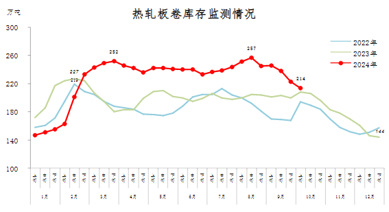 10月上旬,熱軋板卷庫存214萬噸,環(huán)比減少9萬噸,下降4.0%,庫存降幅收窄;比年初增加70萬噸,上升48.6%;比上年同期增加6萬噸,上升2.9%。