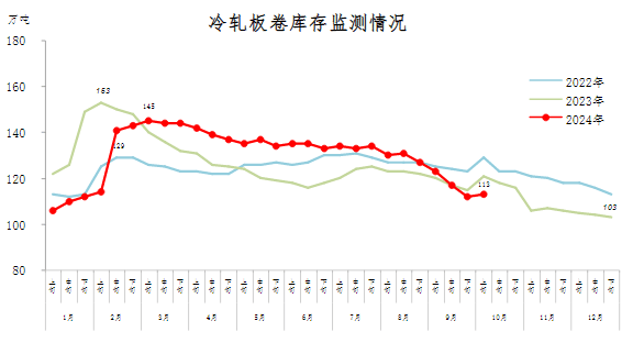 10月上旬,冷軋板卷庫存113萬噸,環(huán)比增加1萬噸,上升0.9%,庫存由下降轉(zhuǎn)為小幅上升;比年初增加10萬噸,上升9.7%;比上年同期減少8萬噸,下降6.6%。