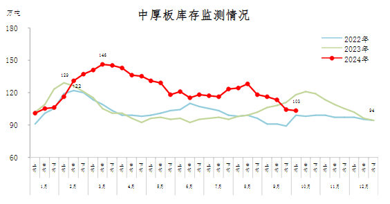 10月上旬,中厚板庫存103萬噸,環(huán)比減少1萬噸,下降1.0%,庫存降幅收窄;比年初增加9萬噸,上升9.6%;比上年同期減少15萬噸,下降12.7%。