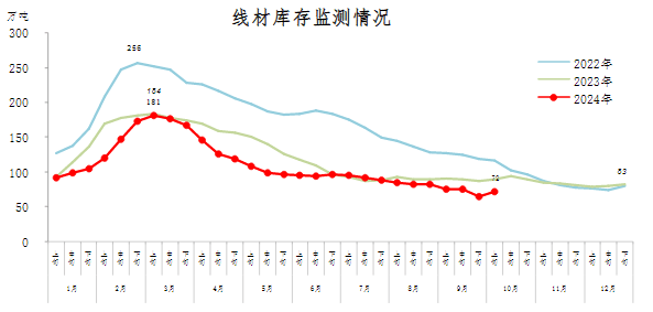 10月上旬,線材庫存72萬噸,環(huán)比增加7萬噸,上升10.8%庫存回升幅度較大;比年初減少11萬噸,下降13.3%;比上年同期減少17萬噸,下降19.1%。