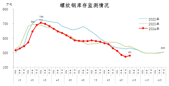 10月上旬,螺紋鋼庫存261萬噸,環(huán)比增加17萬噸,上升7.0%,庫存連續(xù)8旬下降后首次上升;比年初減少44萬噸,下降14.4%;比上年同期減少127萬噸,下降32.7%。