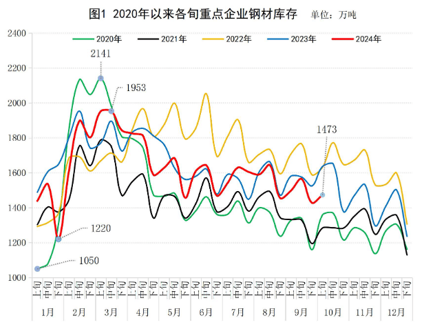 2024年10月上旬,重點(diǎn)統(tǒng)計(jì)鋼鐵企業(yè)(以下簡(jiǎn)稱“重點(diǎn)企業(yè)”)鋼材庫存量1473萬噸,環(huán)比上一旬增加45萬噸,上升3.2%;比年初增加237萬噸,上升19.2%;比上月同旬減少24萬噸,下降1.6%;比去年同旬減少163萬噸,下降10.0%,比前年同旬減少159萬噸,下降9.7%(見圖1)。