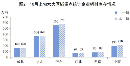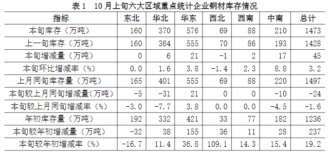10月上旬,除東北地區(qū)重點(diǎn)企業(yè)鋼材庫存較上一旬基本持平,西北地區(qū)略有下降外,其它地區(qū)均有不同程度增長(zhǎng)(見圖2、表1),具體情況為: