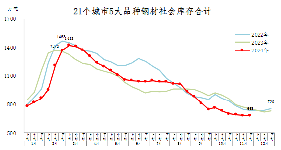 11月下旬,21個(gè)城市5大品種鋼材社會(huì)庫(kù)存683萬(wàn)噸,環(huán)比減少1萬(wàn)噸,下降0.1%,庫(kù)存變化不大;比10月下旬減少17萬(wàn)噸,下降2.4%;比年初減少46萬(wàn)噸,下降6.3%;比上年同期減少72萬(wàn)噸,下降9.5%。