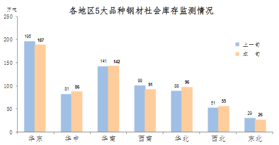 11月下旬,分地區(qū)來(lái)看,七大區(qū)域鋼材庫(kù)存環(huán)比各有升降,具體情況為:西南、華東庫(kù)存環(huán)比均減少8萬(wàn)噸,分別下降8.1%和4.1%,為減量最大地區(qū);東北減少3萬(wàn)噸,下降10.3%,為降幅最大地區(qū);華北增加8萬(wàn)噸,上升9.1%,為增量和升幅最大地區(qū);華中增加5萬(wàn)噸,上升6.2%;西北增加4萬(wàn)噸,上升7.8%;華南增加1萬(wàn)噸,上升0.7%。