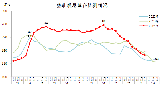 11月下旬,熱軋板卷庫(kù)存164萬(wàn)噸,環(huán)比減少7萬(wàn)噸,下降4.1%,庫(kù)存連續(xù)下降;比10月下旬減少25萬(wàn)噸,下降13.2%;比年初增加20萬(wàn)噸,上升13.9%;比上年同期減少6萬(wàn)噸,下降3.5%。