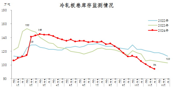 11月下旬,冷軋板卷庫(kù)存94萬(wàn)噸,環(huán)比減少3萬(wàn)噸,下降3.1%,庫(kù)存繼續(xù)下降;比10月下旬減少11萬(wàn)噸,下降10.5%;比年初減少9萬(wàn)噸,下降8.7%;比上年同期減少12萬(wàn)噸,下降11.3%。