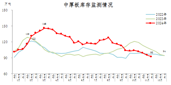 11月下旬,中厚板庫(kù)存92萬(wàn)噸,環(huán)比減少3萬(wàn)噸,下降3.2%;比10月下旬減少10萬(wàn)噸,下降9.8%;比年初減少2萬(wàn)噸,下降2.1%;比上年同期減少13萬(wàn)噸,下降12.4%。