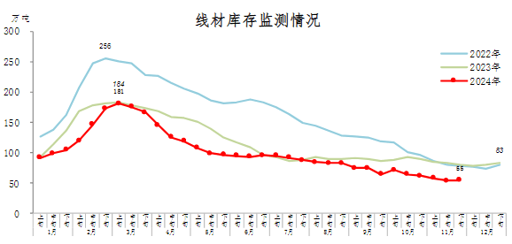 11月下旬,線材庫(kù)存55萬(wàn)噸,環(huán)比增加1萬(wàn)噸,上升1.9%,庫(kù)存由降轉(zhuǎn)升;比10月下旬減少7萬(wàn)噸,下降11.3%;比年初減少28萬(wàn)噸,下降33.7%;比上年同期減少26萬(wàn)噸,下降32.1%。