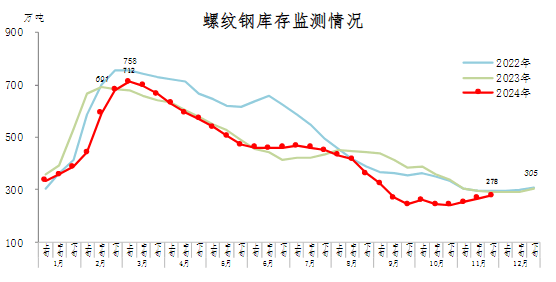 11月下旬,螺紋鋼庫(kù)存278萬(wàn)噸,環(huán)比增加11萬(wàn)噸,上升4.1%,庫(kù)存連續(xù)上升;比10月下旬增加36萬(wàn)噸,上升14.9%;比年初減少27萬(wàn)噸,下降8.9%;比上年同期減少15萬(wàn)噸,下降5.1%。