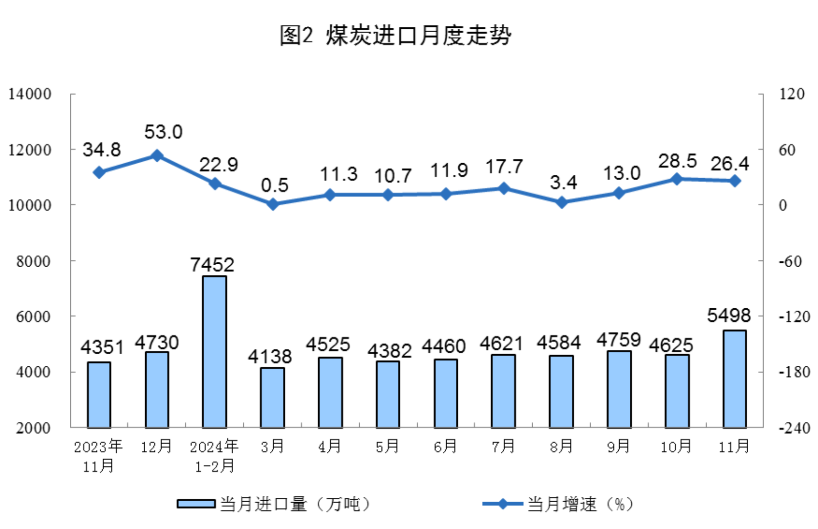 原煤生產(chǎn)穩(wěn)定增長(zhǎng)。11月份,規(guī)上工業(yè)原煤產(chǎn)量4.3億噸,同比增長(zhǎng)1.8%;日均產(chǎn)量1426.6萬(wàn)噸。進(jìn)口煤炭5498萬(wàn)噸,同比增長(zhǎng)26.4%。