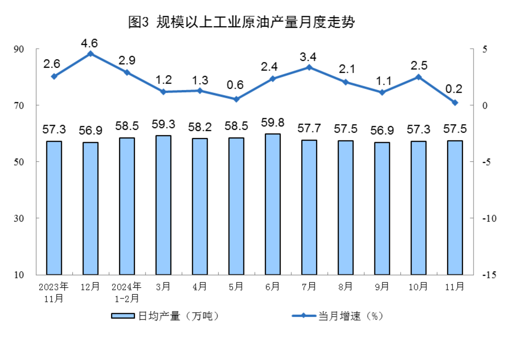 原油生產(chǎn)保持增長(zhǎng)。11月份,規(guī)上工業(yè)原油產(chǎn)量1725萬(wàn)噸,同比增長(zhǎng)0.2%;日均產(chǎn)量57.5萬(wàn)噸。進(jìn)口原油4852萬(wàn)噸,同比增長(zhǎng)14.4%。