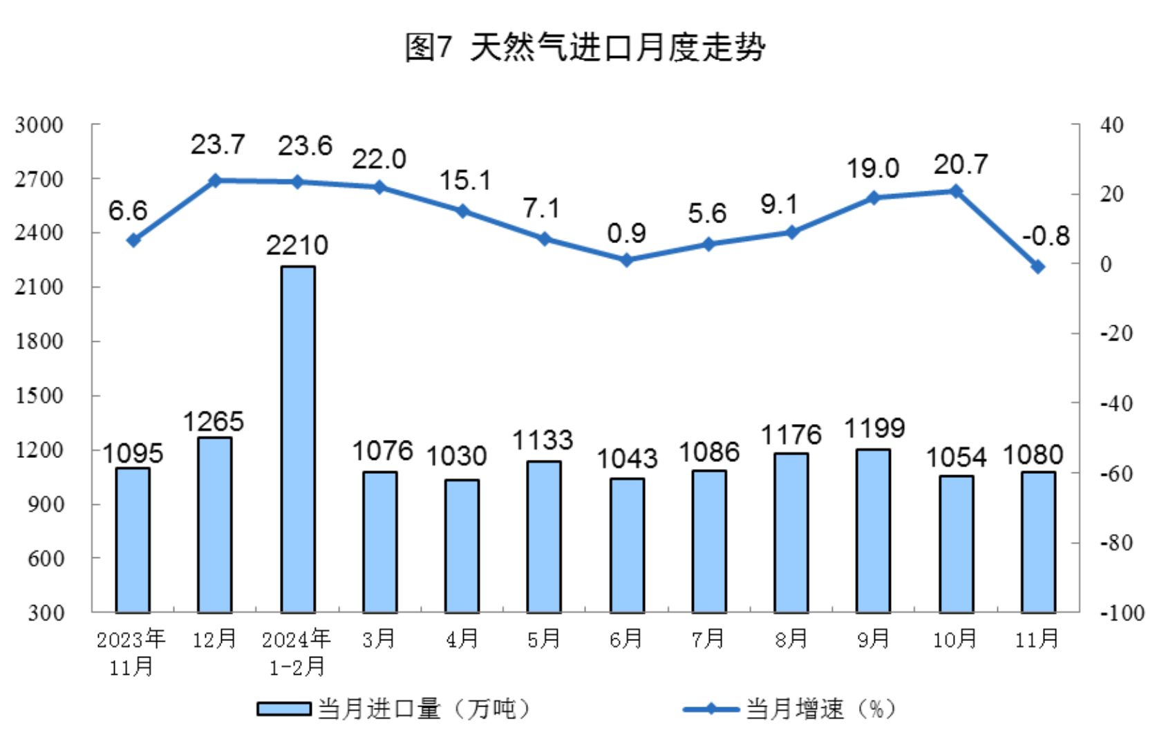 天然氣生產(chǎn)穩(wěn)步增長(zhǎng)。11月份,規(guī)上工業(yè)天然氣產(chǎn)量207億立方米,同比增長(zhǎng)3.1%;日均產(chǎn)量6.9億立方米。進(jìn)口天然氣1080萬(wàn)噸,同比下降0.8%。