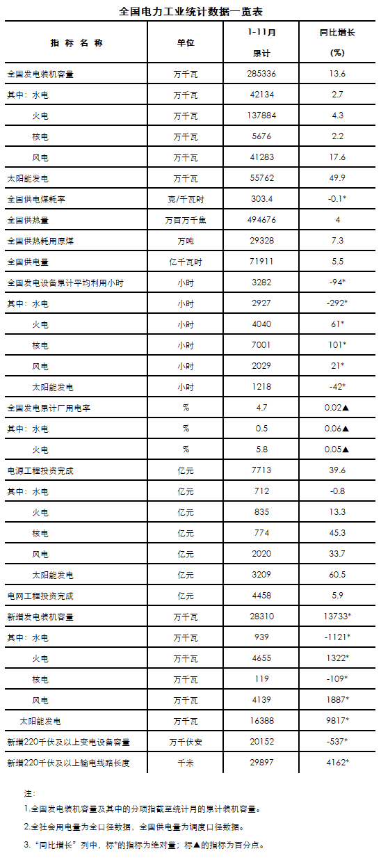 12月20日,國家能源局發(fā)布1-11月份全國電力工業(yè)統(tǒng)計(jì)數(shù)據(jù)。