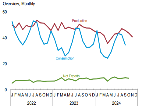 消費方面,報告顯示,2024年9月份,美國煤炭總消費量為3453.5萬短噸,同比下降7.52%,環(huán)比下降18.57%。