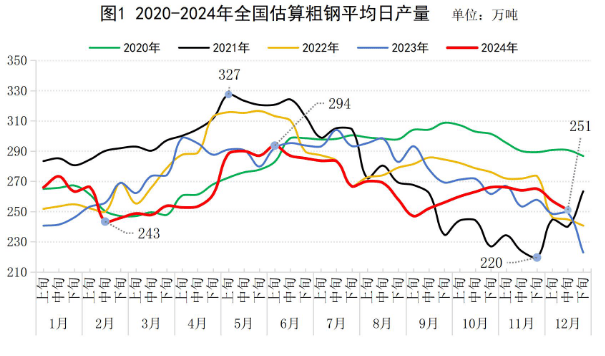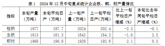2024年12月中旬,重點統(tǒng)計鋼鐵企業(yè)共生產(chǎn)粗鋼1977萬噸,平均日產(chǎn)197.7萬噸,日產(chǎn)環(huán)比下降2.3%;生鐵1813萬噸,平均日產(chǎn)181.3萬噸,日產(chǎn)環(huán)比下降1.6%;鋼材1968萬噸,平均日產(chǎn)196.8萬噸,日產(chǎn)環(huán)比增長2.1%(見表1)。