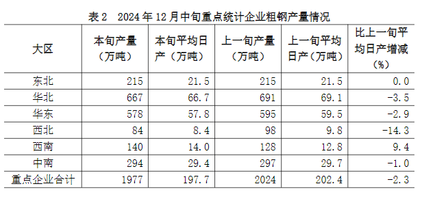 12月中旬六大地區(qū)中,除西南地區(qū)重點統(tǒng)計企業(yè)粗鋼日產(chǎn)量較上一旬增長、東北地區(qū)粗鋼日產(chǎn)量較上一旬基本持平外,其它地區(qū)均有不同程度下降(詳見表2),具體為: