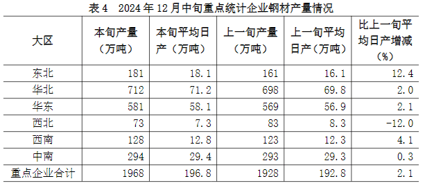 12月中旬六大地區(qū)中,除西北地區(qū)重點統(tǒng)計企業(yè)鋼材日產(chǎn)量較上一旬下降外,其它地區(qū)均有不同程度增長(詳見表4),具體為: