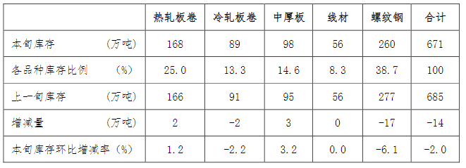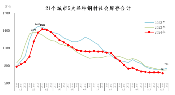 12月中旬,21個城市5大品種鋼材社會庫存671萬噸,環(huán)比減少14萬噸,下降2.0%,庫存再次探底;比年初減少58萬噸,下降8.0%;比上年同期減少48萬噸,下降6.7%。