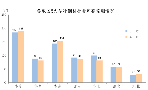 12月中旬,分地區(qū)來看,七大區(qū)域鋼材庫存環(huán)比各有升降,具體情況為:華北庫存環(huán)比減少18萬噸,下降18.4%,為減量和降幅最大地區(qū);華南庫存環(huán)比增加11萬噸,為增量最大地區(qū);東北增加3萬噸,上升11.1%,為增幅最大地區(qū);西南減少6萬噸,下降6.6%;西北減少1萬噸,下降1.8%;華中減少7萬噸,下降8.0%;華東增加4萬噸,上升2.2%。