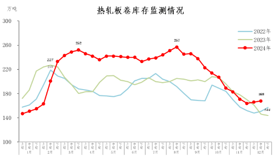 12月中旬,熱軋板卷庫存168萬噸,環(huán)比增加2萬噸,上升1.2%,庫存連續(xù)兩旬小幅上升;比年初增加24萬噸,上升16.7%;比上年同期增加22萬噸,上升15.1%。