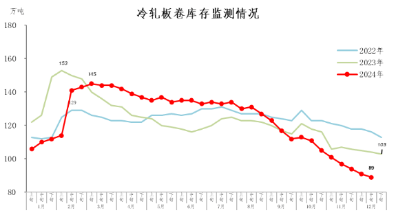 12月中旬,冷軋板卷庫存89萬噸,環(huán)比減少2萬噸,下降2.2%,庫存繼續(xù)小幅下降;比年初減少14萬噸,下降13.6%;比上年同期減少15萬噸,下降14.4%。