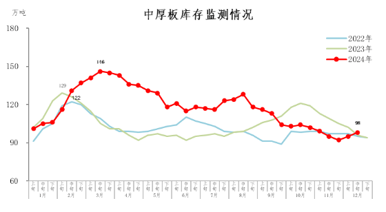 12月中旬,中厚板庫存98萬噸,環(huán)比增加3萬噸,上升3.2%,庫存小幅上升;比年初增加4萬噸,上升4.3%;比上年同期增加2萬噸,上升2.1%。