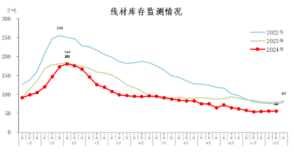 12月中旬,線材庫存56萬噸,環(huán)比持平;比年初減少27萬噸,下降32.5%;比上年同期減少24萬噸,下降30.0%。