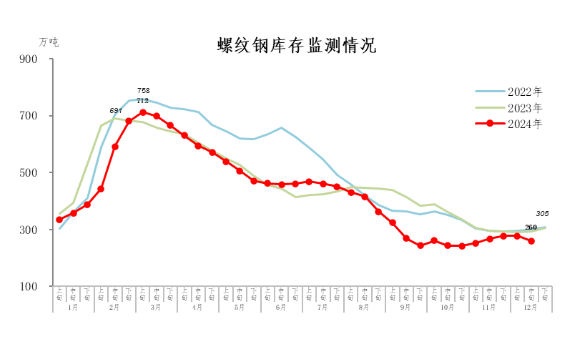 12月中旬,螺紋鋼庫存260萬噸,環(huán)比減少17萬噸,下降6.1%,庫存繼續(xù)下降;比年初減少45萬噸,下降14.8%;比上年同期減少33萬噸,下降11.3%。